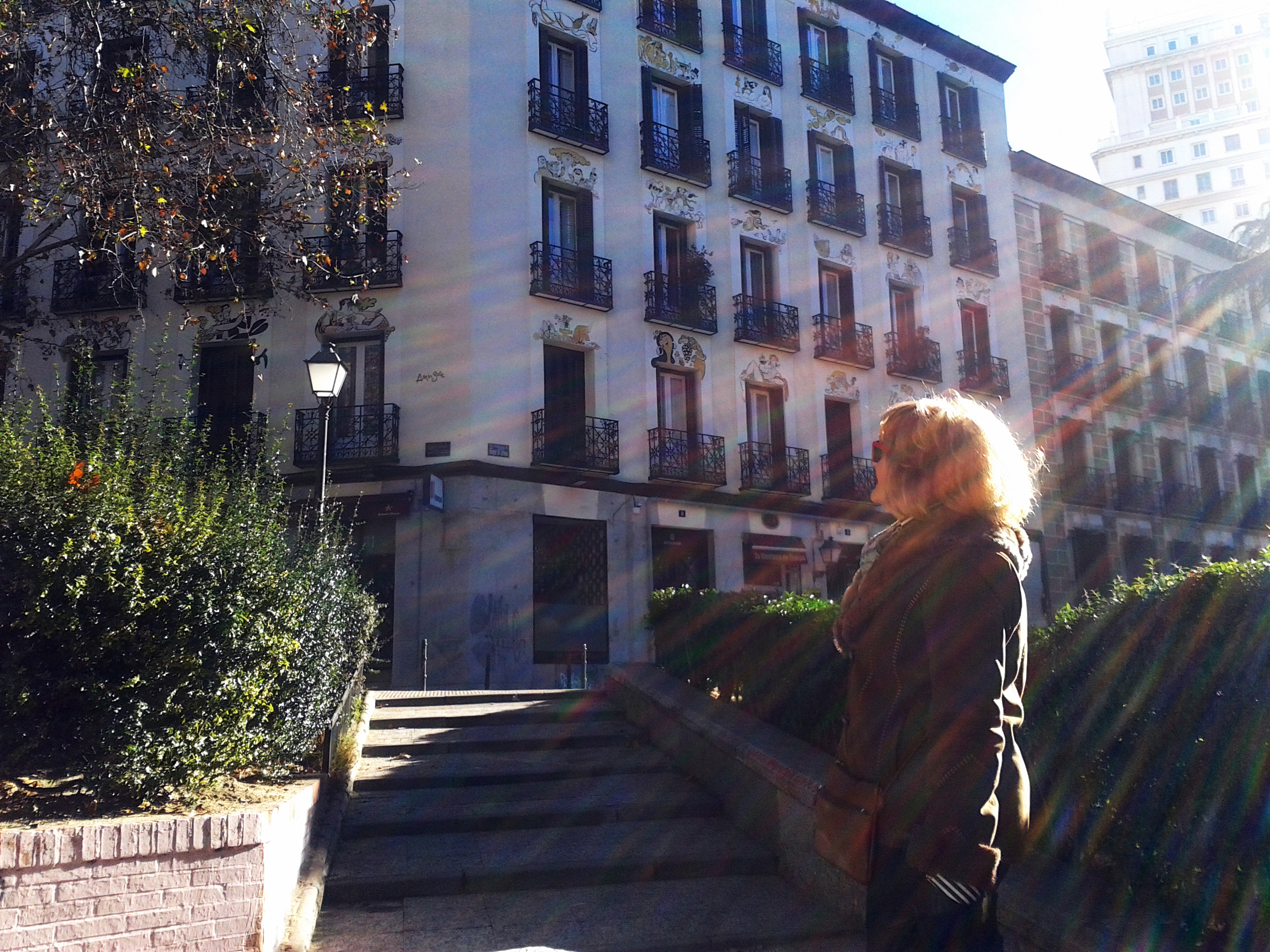 La calle Espíritu Santo es tan distinta de día… Ahora además está llena de tiendas curiosas y portales con mucha historia, con muchos «Secretos». Por la Corredera Alta de San Pablo llegamos a la plaza de San Ildefonso. Ya no está El Grial, pub que solía frecuentar. Hay otro en su lugar, pero pasada la plaza, en la calle Colón, me alegró ver aún vivo «Al’Laboratorio», donde siempre había buena música en directo. Solía ir  a ver tocar a los Tea (un grupazo de Madrid). Con su música en mente tomamos rumbo hacia la Gran Vía…