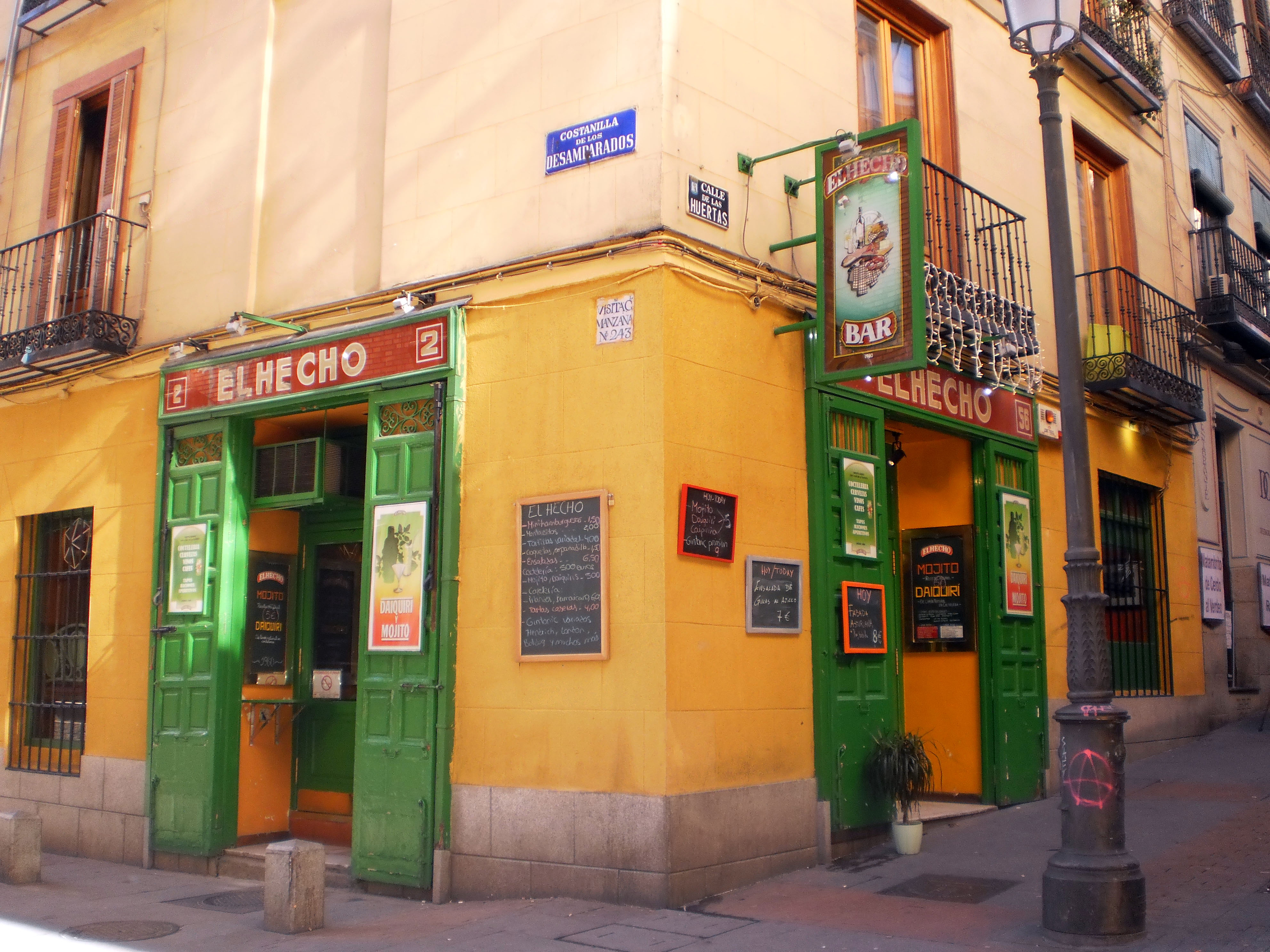 Entramos en el “barrio de las letras” en dirección a su gran vía, la calle Huertas, y antes de recorrerla leyendo las citas de los clásicos de la literatura española que hay grabados en bronce sobre los adoquines, paramos a tomar fuerzas en “El Hecho”. Um! qué tortillas y tapitas… de ser la hora de comer nos zamparímos a gusto la fabada del día. 8 euros pan y postre incluidos. Pero aún es pronto y pedimos cuatro cañas, que como estamos en Madrid, siempre se acompañan por 4 tapas bien majas. (Precio de caña y tapa elaborada: 1,40 euros).