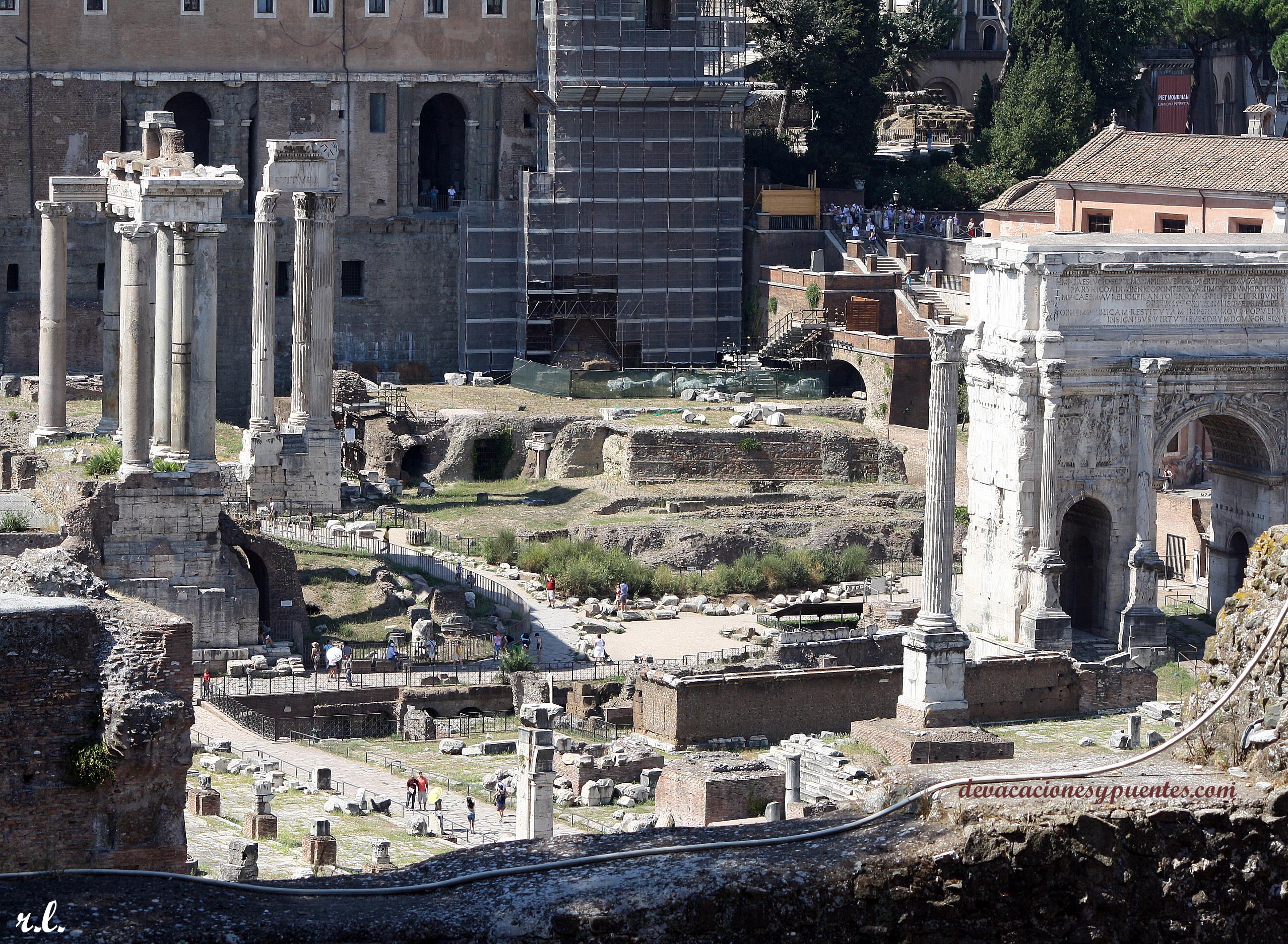 Caminando entramos en el Palatino, “cuna de Roma”. Allí Rómulo fundó la ciudad y desde allí se puede acceder al Foro, el epicentro de la urbe donde te minimizas al tamaño de una pulga ante los colosales restos del pasado. Es más que recomendable hacerse con una guía o libro que identifique cada edificio y su historia (aquí dejo el enlace a un blog que lo hace). Paseamos por el patio de la Casa de las Vestales (las mujeres que no podían tener relaciones ni casarse hasta haber pasado 30 años cuidando del fuego sagrado). Paseamos junto al arco de Tito, el templo de Rómulo, el del Cástor, el de Saturno, el de Vespasiano, el arco de Septimio Severo y entramos en la alta curia (sede del senado), entre otros restos.