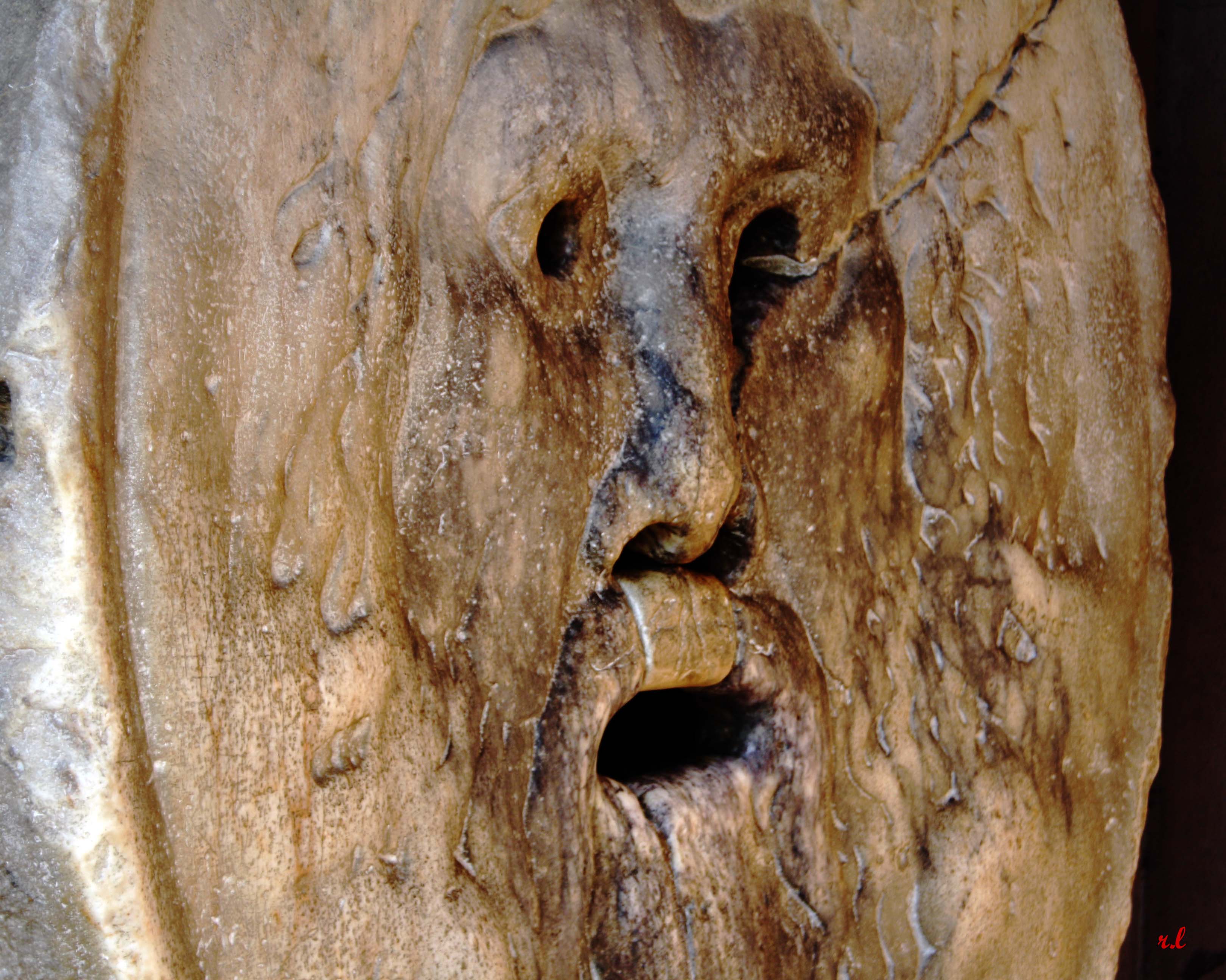 A la salida del museo nos topamos con el rodaje de una peli. Nos quedamos un ratillo curioseando hasta que vimos, desilusionados, que era una italiana. Bajamos entonces hacia la «Bocca della Veritá«, la gran máscara que se supone corta la mano a quien la mete en su boca si es un mentiroso… al menos eso cuenta la leyenda medieval que hizo famosa Vacaciones en Roma.