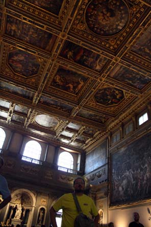 En una de sus salas más conocidas (Sala de los Quinientos) vimos personas estudiando con artilugios de alta tecnología un mural enorme (pintado por Vasari). Resulta que se cree que bajo el inmenso fresco está escondida una obra de Leonardo da Vinci. No me extrañaría que en una tercera entrega de las aventuras del profesor de “El Código Da Vinci” nos encontráramos con esta investigación, no exenta de pistas cinematográficas. En el mural de Vasari, a los ojos de todos, una bandera verde que porta un soldado del enlatado ejército tiene escritas dos palabras: “Cerca e trova” (busca y encuentra).