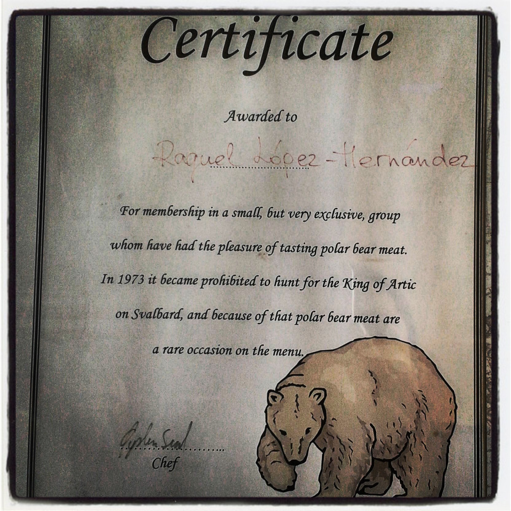 No ha de extrañarse de ver a gente con rifles a sus espaldas. Lo hacen porque salen del pueblo. Por todos lados hay souvenirs con imagenes de osos e incluso señales de trafico que, al igual que en la carretera de El Pardo te previenen del advenimiento de un ciervo, allí lo hacen sobre esta bestia salvaje. Al contrario que zorros, focas o renos, es difícil ver a un oso, pero haberlos, «haylos»y se han zampado algún turista, de ahí que haya que ir armado fuera de la población. El primer disparo ha de ser al aire, para ahuyentarle. Si se empeña, el segundo en la cabeza o date por finiquitado. Está prohibido desde 1973 matar a estos reyes del Ártico y sólo ha de hacerse en defensa propia. Si ocurre, se abre una investigación sobre los hechos y aparecen miembros del Instituto Polar Ártico a recoger muestras de todo y ponerlo en bolsitas como si fueran agentes del CSI.  IMG-20130317-WA0003