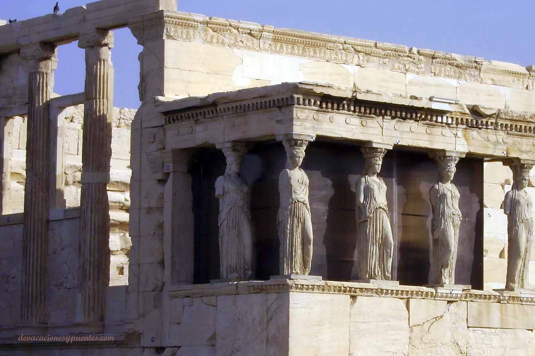 Poco queda hoy de aquella magia en la Acrópolis, lugar que como Pompeya está plagado de perros vagabundos. Andan, yacen y pululan entre las ruinas como si fueran las sombras de los dioses. Entre esas ruinas figuran el Propólieo y el Templo de Atena Niké, construido para recordar la victoria griega sobre los persas. Y también está el Erecteion, templo levantado en honor a Atenea y Poseidón y Erecteo, rey de la ciudad. El Erecteion es famoso por las columnas cariátides de formas femeninas…