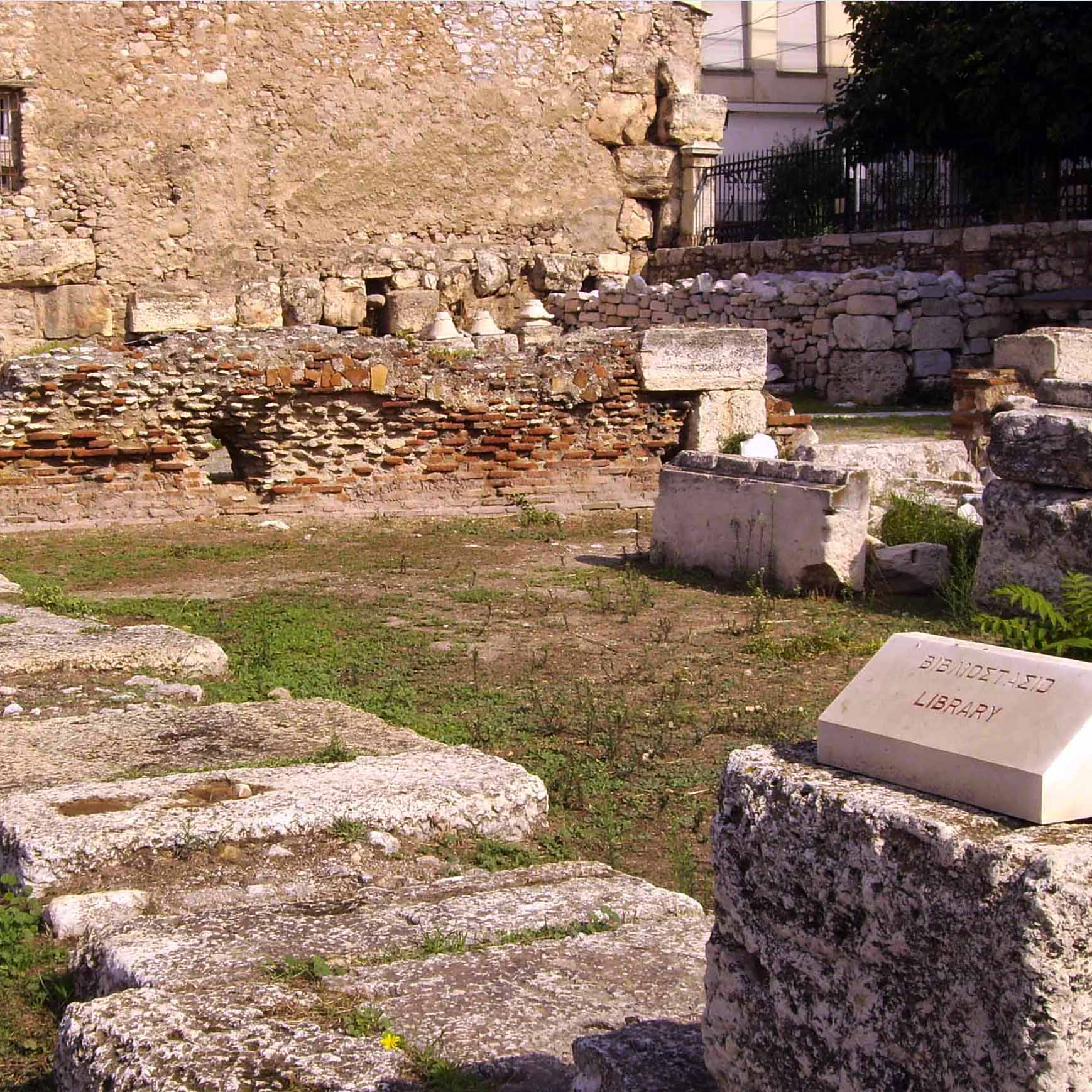 El autobús deja en la plaza Sintagama, donde te dan unas horas libres. La plaza está en la «Plaka», el centro lleno de comercios y tabernas y próximo a una antigua biblioteca que es posible visitar con el pase utilizado en la Acrópolis.