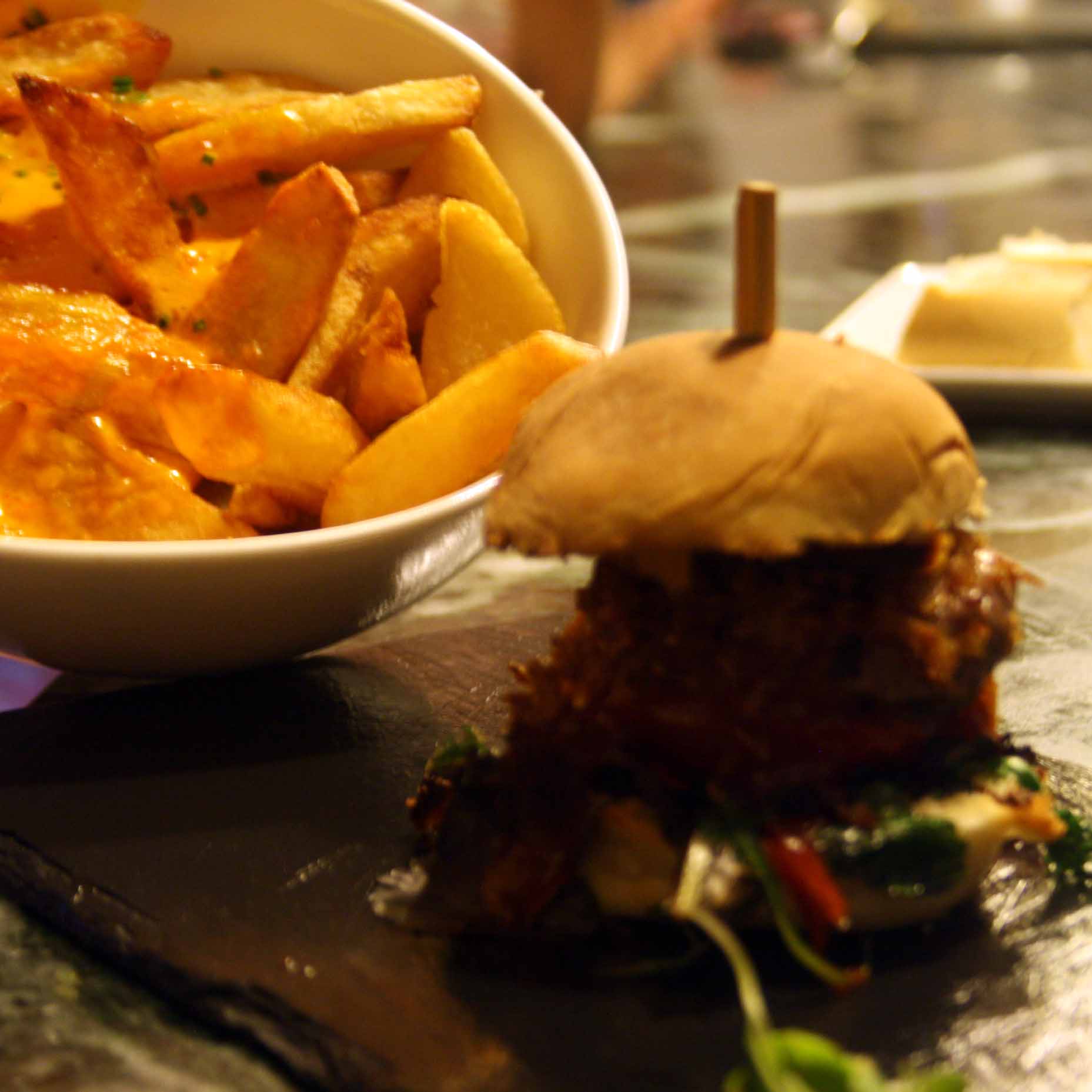 La siguiente parada fue El Mesón de Gonzalo. Un local próximo a la plaza Mayor. Allí cambiamos al vino. Dos Viñas del Cámbrico a tres euros cada uno que sirvieron acompañados de cortezas peludas recalentadas que allí, en vez de “morro”, llaman “jeta”. También pedimos unas bravas, que por el mismo precio que las anteriores nos encantaron. Ahora, lo espectacular fue la hamburguesita de morrucha (llamada así por las vacas de la zona cuya carne tiene su propia denominación de origen), y sobre todo las croquetas de jamón, las mejores que he probado después de las que hacía mi abuelo Herminio.