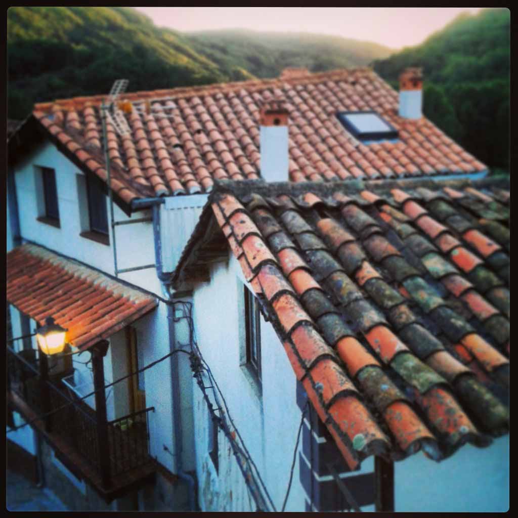 Además de las casas rurales y el hostal, hay algún piso en el pueblo que se alquila para vacaciones. El nuestro era amplio, con tres alcobas de las de antes, de esas sin ventana o con una horizontal a ras del techo que da al salón. Estaba en la plaza del abrevadero donde antaño se llevaba al ganado. Desde su larga terraza se veía toda la sierra. Tras ella está Extremadura, el Valle del Jerte y la Vera, que dicen envían la Primavera a Montemayor del Río cada año, correspondiendo éste con el otoño. También desde ella se veían los tejados, el cigüeñal y la casa “del reloj”, justo enfrente, invitando a inventarse historias a lo “la rue del Percebe” retocadas al tiempo medieval.