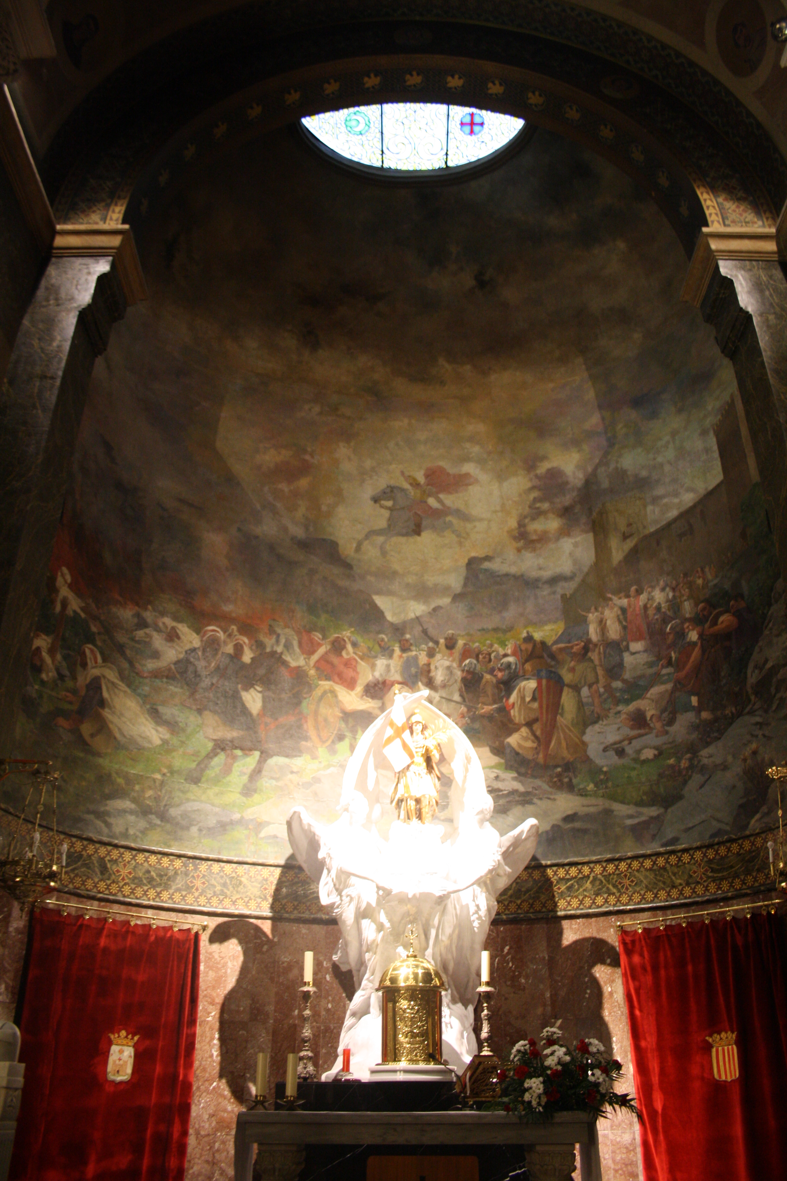 Se llega (si se viene de Alicante) por el conocido como “Barranc de la Batalla”, lugar donde tuvo lugar la batalla entre moros y cristianos en la que el caudillo moro Al-Azraq quiso reconquistar la ciudad y donde, según la leyenda, San Jorge se apareció en su caballo lanzando flechas para ayudar a los defensores cristianos, impactando una de sus saetas en el propio Al-Azraq. Todos los años, a finales de Abril la ciudad reproduce estos acontecimientos históricos en sus fiestas de Moros Y Cristianos declaradas de Interés Turístico Internacional.