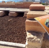 De la parte prehistórica se pasa a la ibérica. Como reza en el panel, el poblado nace en el siglo V a.C., estructurándose más adelante en dos calles longitudinales, comunicadas entre sí por otras transversales, que recorren la península. Se trata de un importante centro comercial, distribuidor de mercancías y productor de vino y salazones. Destacan dos templos en los que se pueden entrever elementos de influencia semita, almacenes y viviendas lo que se interpreta como signo de que el emplazamiento era un “Emporium” (establecimiento exclusivamente comercial). Solamente se ha excavado una parte del poblado ibérico. De lo que si lo ha sido, encontramos el denominado “Templo A”, gran edificio de tres naves en el que se han encontrado fragmentos de esculturas humanas y pebeteros de cabeza femenina. Se cree que pudo ser también una casa palacial o vivienda.