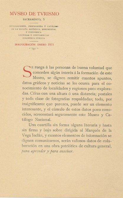 Fuera de esta exposición es difícil poder ver un compendio de elementos utilizados para la promoción en los albores del turismo de España. De hecho, hoy aún no existe ningún Museo Nacional del Turismo, pese a ser nuestro principal Producto Interior Bruto y que ya en 1915 hubo alguien que empezó a decir que sería bueno hacerlo… el Marqués de Valle Inclán. Aquí os dejamos cómo reclamaba colaboración para tal cometido.