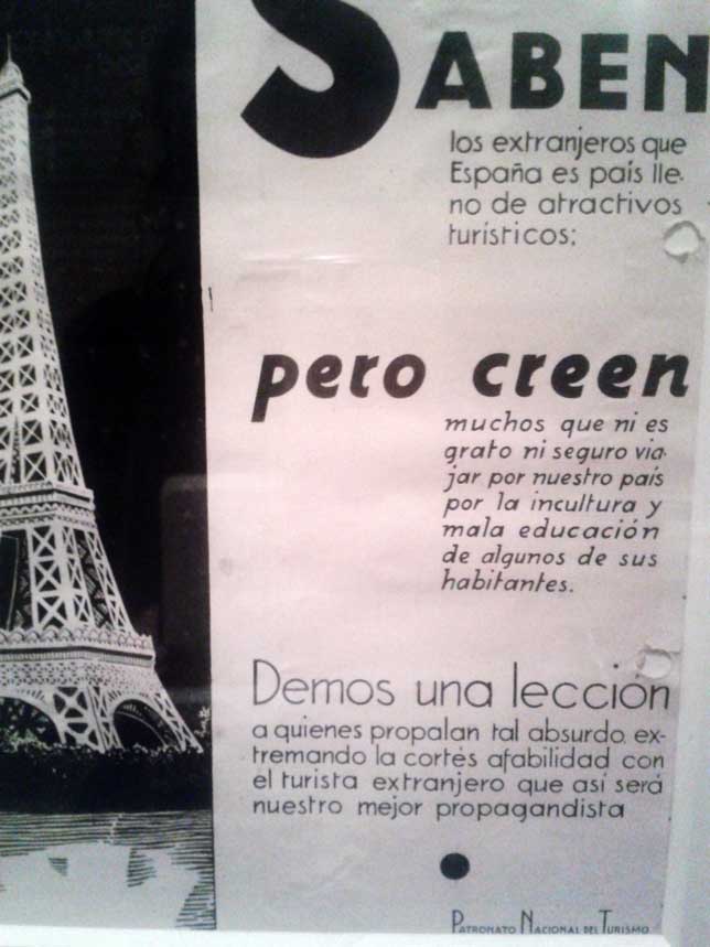 Pero llegó la guerra. Todo parecía haberse paralizado y ambos bandos destruían patrimonio según simbologías y creencias. El interés por el turismo, sin embargo, tampoco desapareció esta vez. El bando franquista puso en marcha rutas de guerra y paseos para turistas por las zonas conquistadas a la República. Después, llegó la impresión del águila a los viejos folletos. Y mucho tiempo después, el «Spain is different» de un jovenzuelo Fraga. Ahí termina el Grand Tour al que invita -la entrada es gratis- la Biblioteca Nacional hasta la semana que viene.