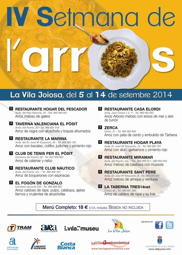 Ha sido llegar a Villajoyosa (Alicante) de regreso de las vacaciones, con los buenos propósitos de encomendarme a la dieta post-vacaciones, y encontrar el primer impedimento: La Setmana de l’Arròs. Un evento gastronómico que arranca el viernes 5 de septiembre, y que se celebra hasta el día 14, en el que 14 restaurantes locales dan el todo en los fogones para servir algo que les sale de maravilla: los arroces.