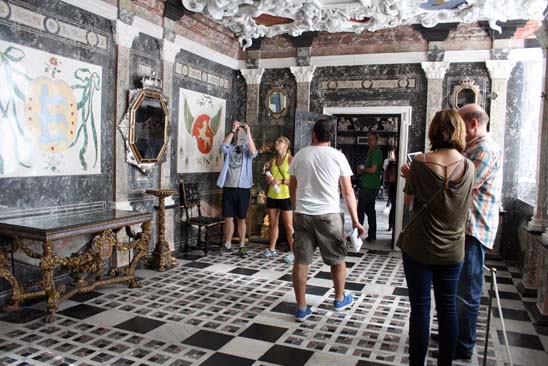 La visita al castillo de Rosenborg fue más rápida de lo que nos hubiera gustado porque íbamos con el tiempo justo, pero aún así, lo disfrutamos un montón. La visita realmente merece la pena. Sus estancias son más pequeñas que otros palacios, quizá para mantener más calientes las habitaciones en este lugar de clima difícil. Como curiosidad, el castillo fue construido según los planos realizados por el rey que lo encargó como casa de verano, Christian IV, extramuros de la ciudad. Este rey no sólo vivió gran parte de su vida en él, sino que falleció en este palacio con bellos tapices y frescos.