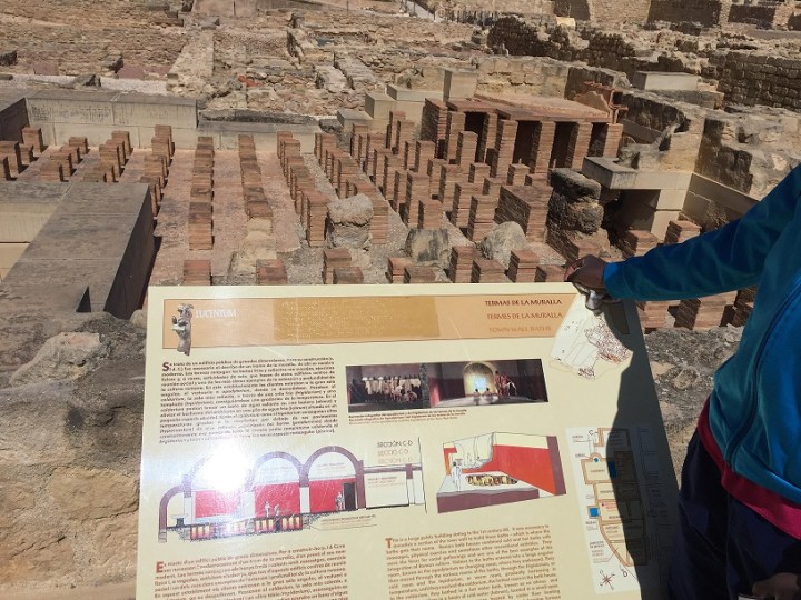 El yacimiento es bastante grande e incluye calles, tiendas, fragmentos de muralla, un par de casas y las termas. En total puede llevar recorrerlo una o dos horas. En el recorrido se puede identificar lo que era cada zona gracias a paneles explicativos. Más allá de eso, y del pequeño folleto que dan en la entrada, es interesante conocer previamente cómo funcionaban las ciudades y en concreto las termas romanas, para poder explicarlas a los niños y que así no se les haga muy aburrido.