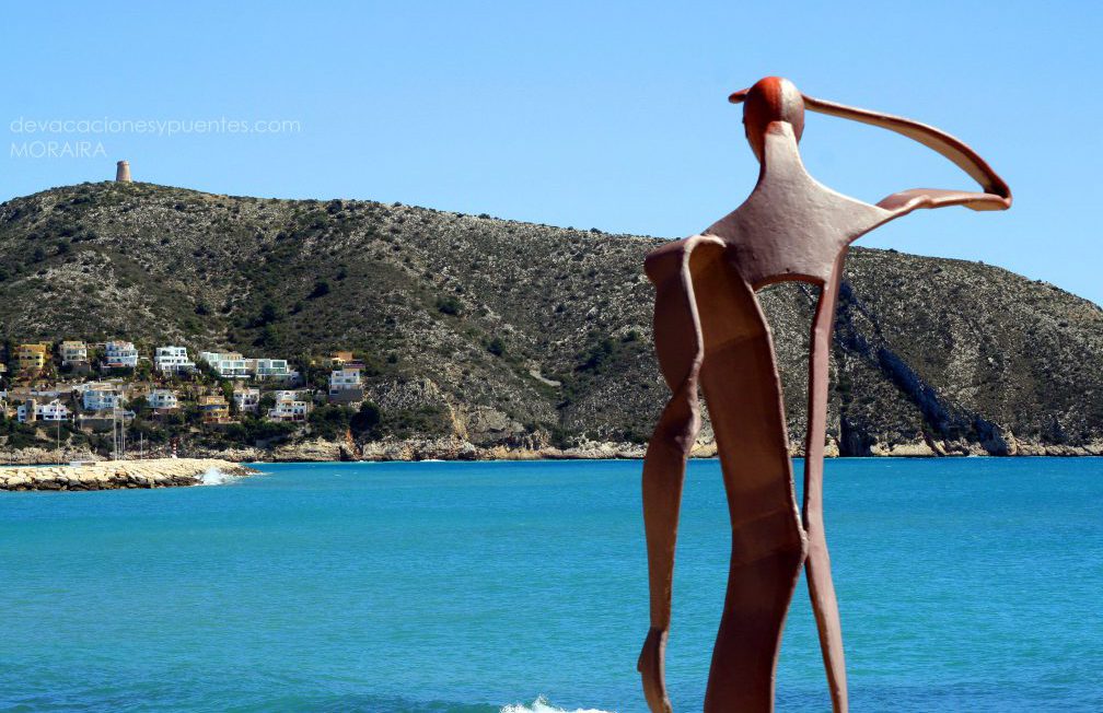 Desde la playa pueden iniciarse varias rutas senderistas (en la oficina de turismo te dan todo tipo de mapas). La más fácil, que bordea la costa y llega hasta la playa de Calpe, no la recomiendo porque transita la mayor parte junto a una carretera muy concurrida. Lo único bueno de realizarla es que puedes tomar algunas fotos junto a sus famosas esculturas y mojarte los pies en diversas calitas. Sobre una de ellas encontramos un restaurante llamado “Chamizo” en el que si tienes suerte puedes pillar una silla casi sobre el mar (nos recomendaron optar aquí por la carne en vez de arroces).