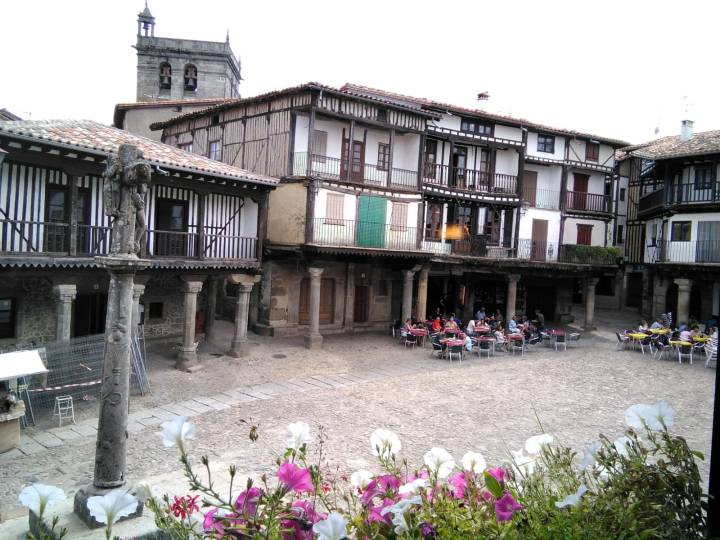 La plaza mayor es lo más típico de La Alberca, aunque de nuevo lo atractivo es el conjunto, el todo. Pequeñas calles, pavimento empedrado, puente y riachuelo y flores para colorear un poco el gris de las fachadas.