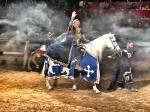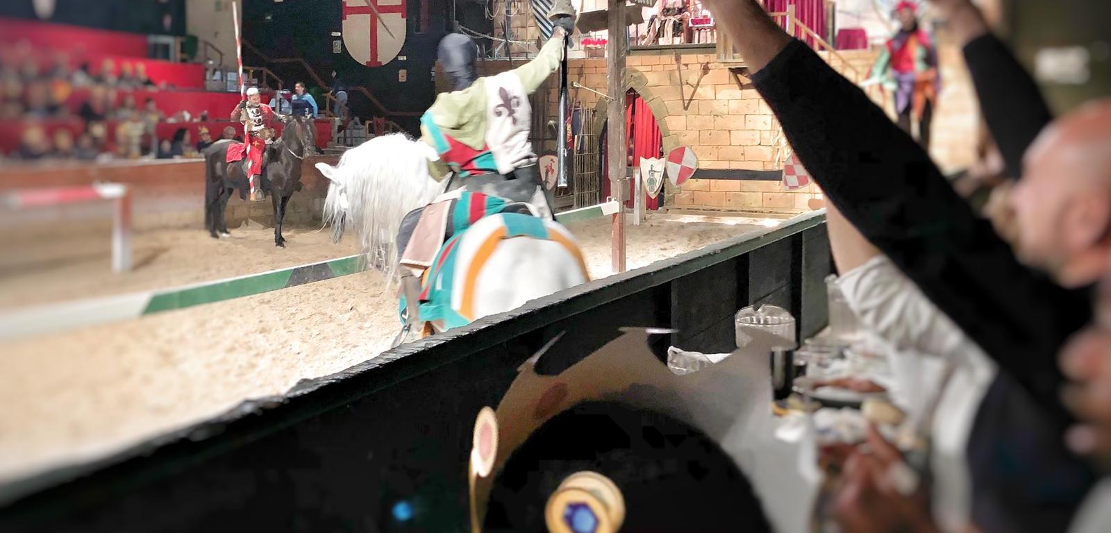 Los mesoneros invitan a sentarse a los comensales en bancos corridos sobre mesas en las que, a la antigua usanza, tienes que ir pidiendo a los de al lado las jarras con las bebidas que reponen generosamente de manera continua. Una vez sentados, te dicen el bando a quien perteneces. Por él –Rojo o Verde- tendrás que gritar y vitorear durante todo el espectáculo.