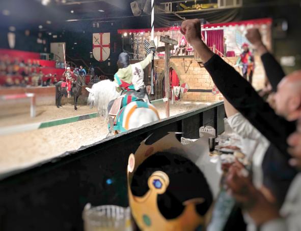 La familia real, con sus trajes medievales, dan la bienvenida al visitante tomando la instantánea del momento de la entrada. Tras unas gruesas cortinas, la oscuridad da paso al graderío que flanquea una pista central de arena sobre la que hay estandartes, acotada en un extremo por un bosque y en otro por lo que simula ser la torre del castillo.
