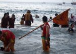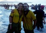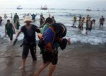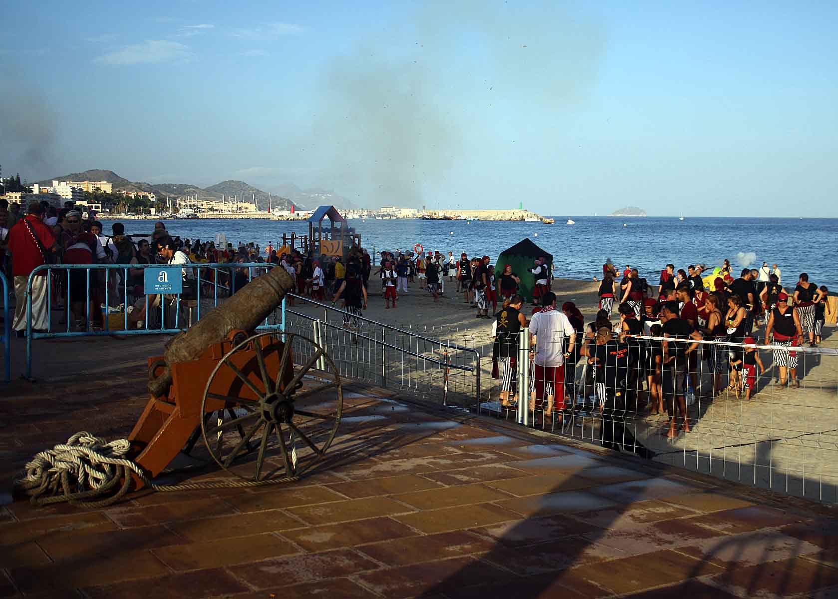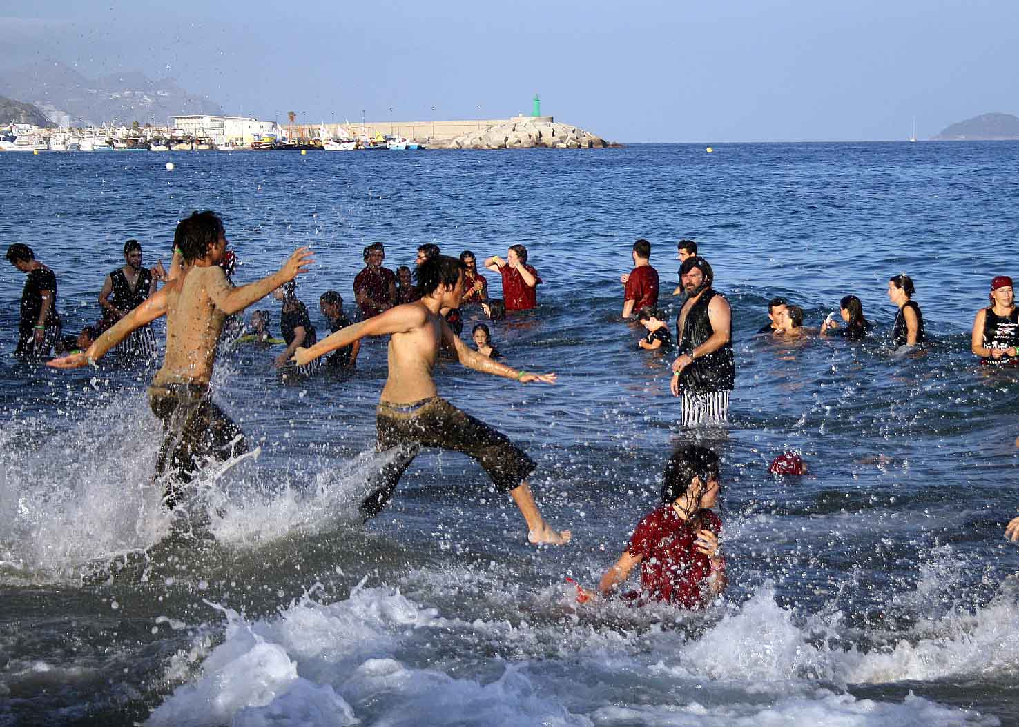 Los festeros del bando moro se lanzan al mar desde las naos para llegar nadando a tierra